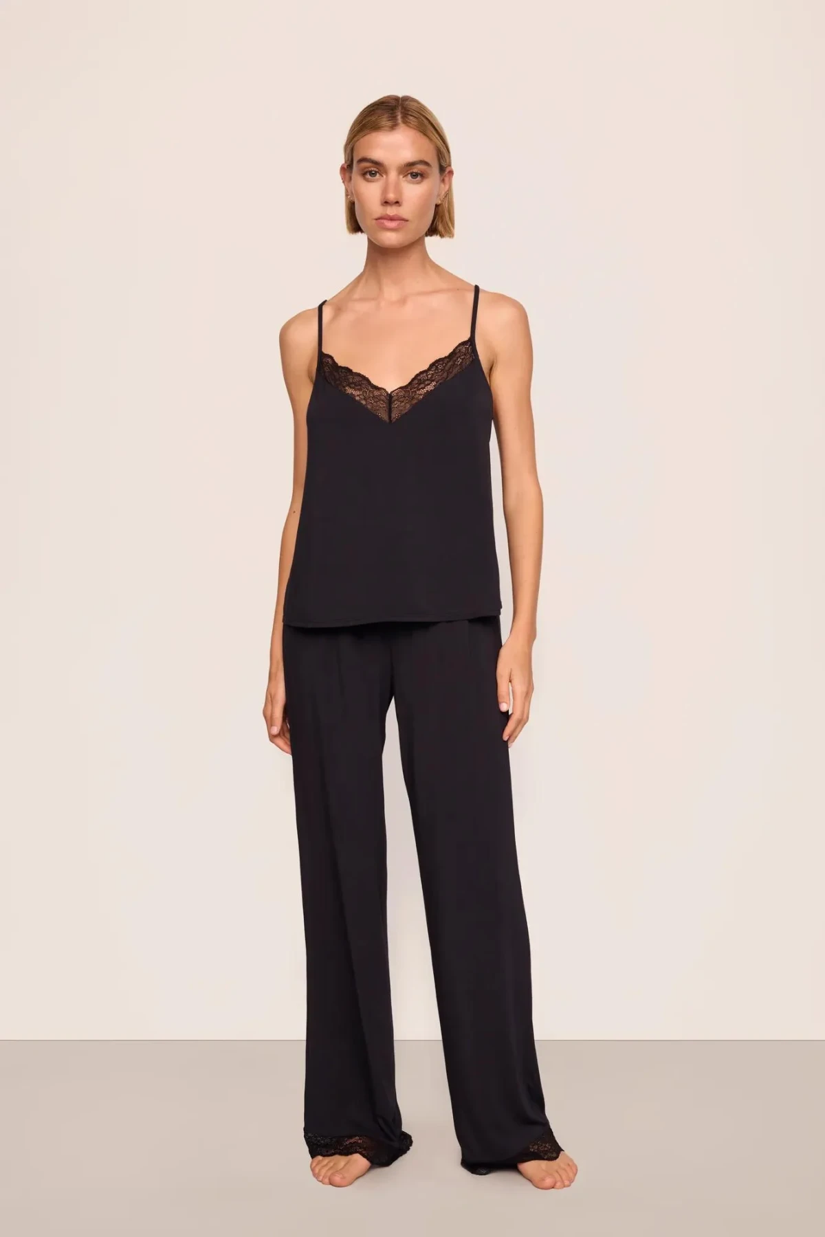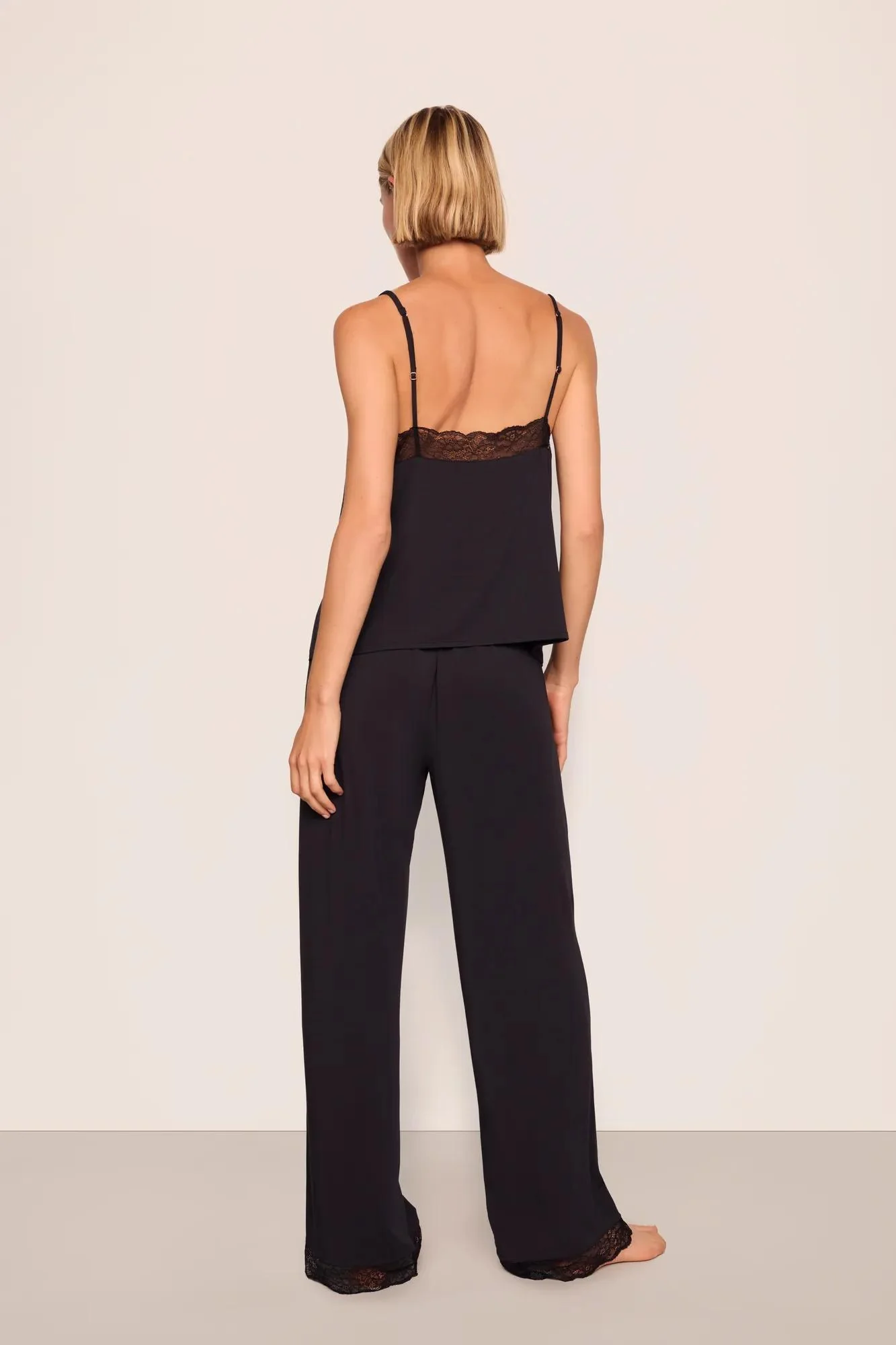 Comfort meets femininity. Made from buttery soft TENCEL™ Modal fibers and a touch of elastane, this fabric is verified by OEKO-TEX® Standard 100, which means it was processed without harmful chemicals. This set features a relaxed, feminine deep V cami with adjustable self-fabric straps and delicate lace trim details at the neckline. The mid-rise pant features a thin elastic waistband, adjustable drawstring tie, and a lace-trimmed hem. Pairs well with our Soft Stretch Recycled Lace Thong/Bikini. Color: Black